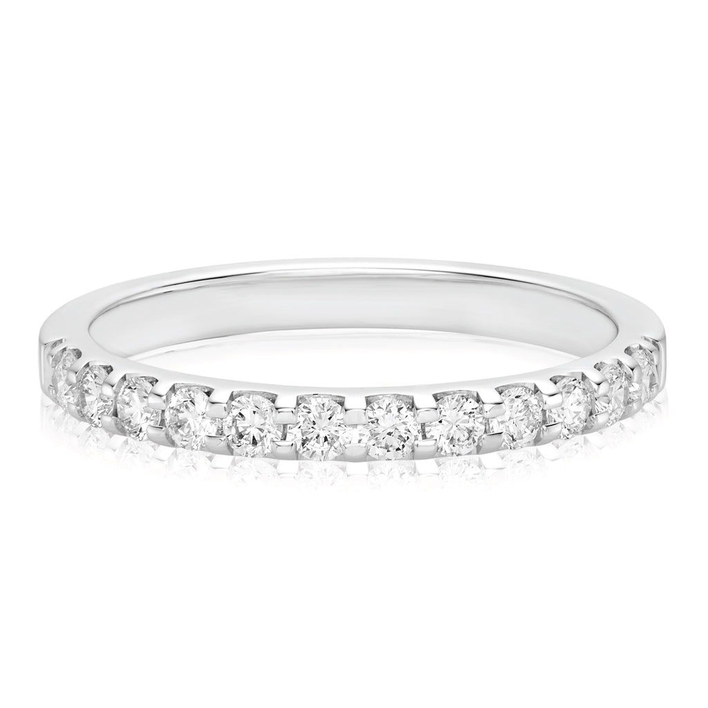 Celebrate eternal love with this Diamond Wedding Band. Featuring 1/3 Carat tw of round brilliant cut diamonds in a claw setting, finished with 18ct White Gold.