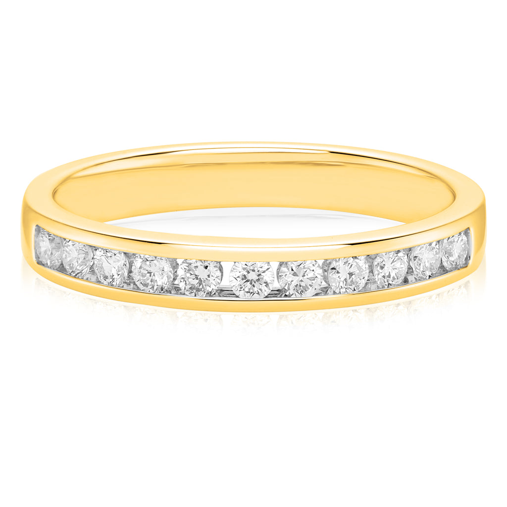 Celebrate eternal love with this Diamond Wedding Band. Featuring 1/4 Carat tw of round brilliant cut diamonds in a channel setting, finished with 18ct Yellow Gold.