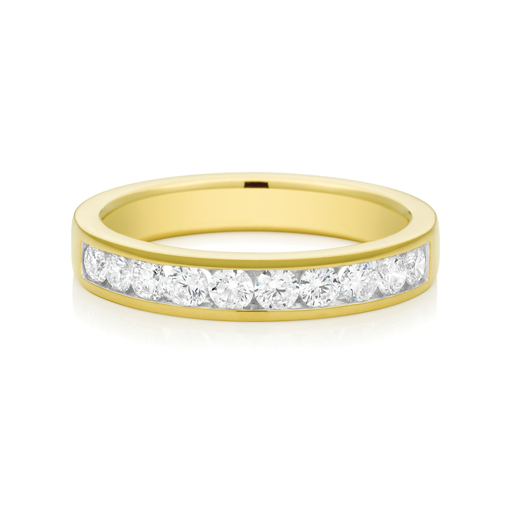 Celebrate eternal love with this Diamond Wedding Band. Featuring 1/2 Carat tw of round brilliant diamonds in a channel setting, finished with 18ct Yellow Gold.