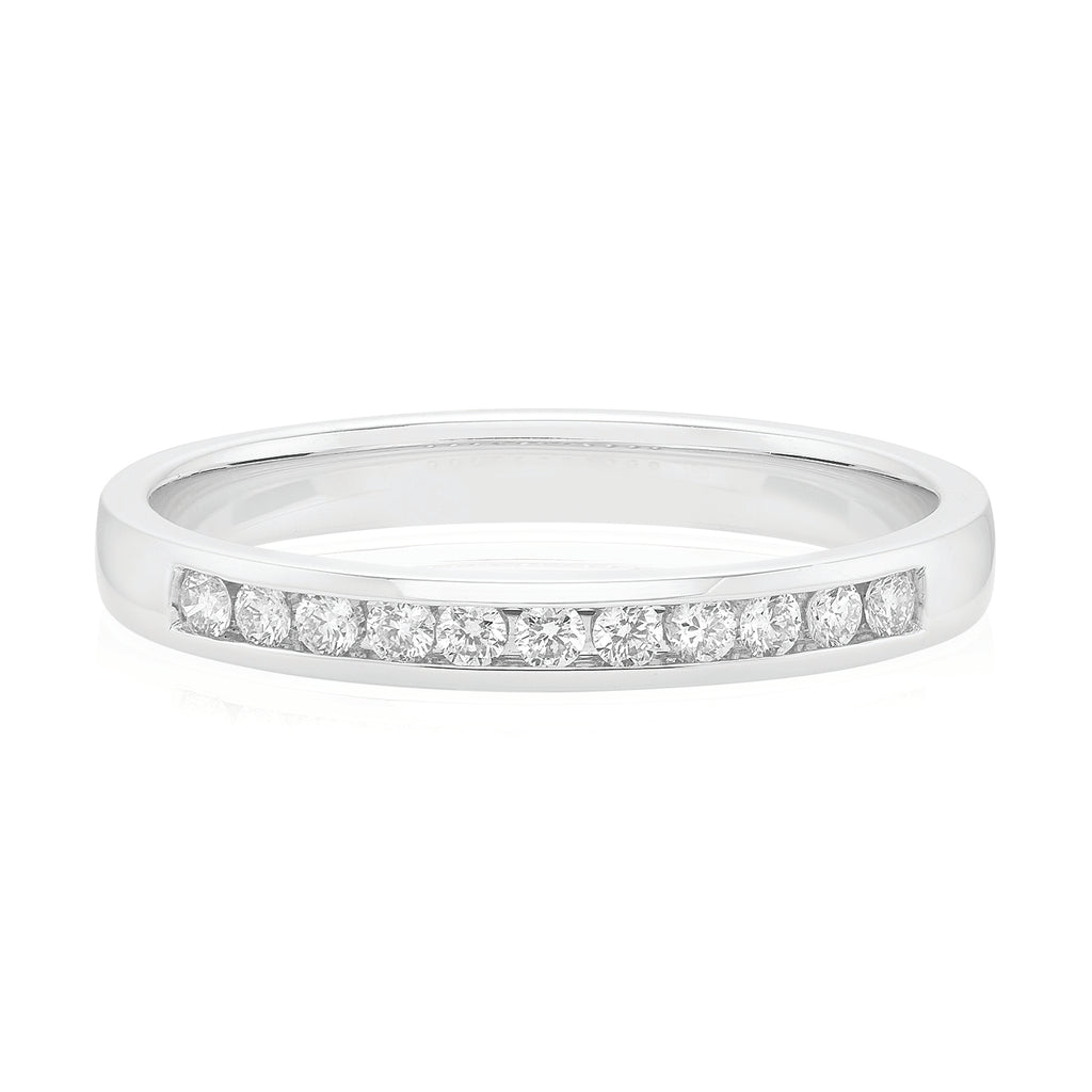 Celebrate eternal love with this curved diamond eternity ring, featuring 0.15 Carat tw of round brilliant diamonds in a claw setting, finished with 18ct White Gold.