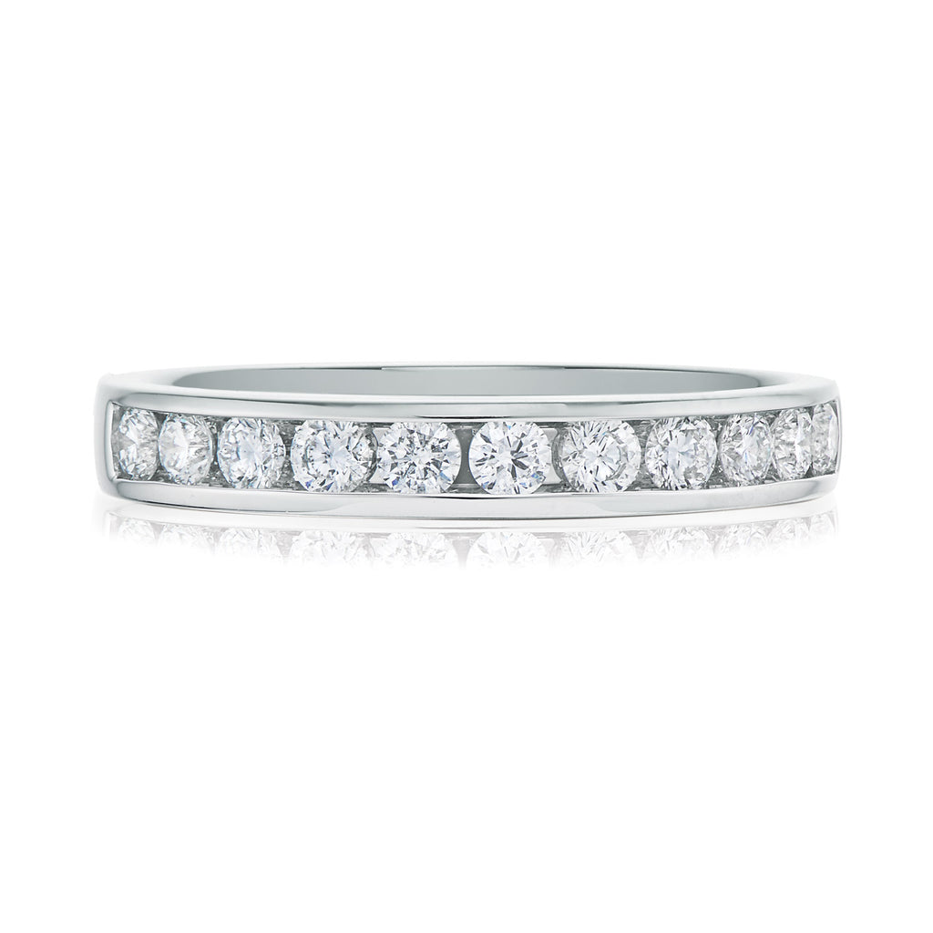 Celebrate eternal love with this Diamond Wedding Band. Featuring 1/2 Carat tw of round brilliant cut diamonds in a channel setting, finished with 18ct White Gold.