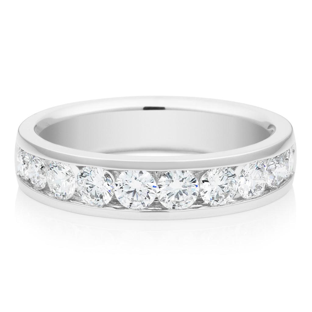 Celebrate eternal love with this Diamond Wedding Band. Featuring 1 Carat tw of round brilliant cut diamonds in a channel setting, finished with 18ct White Gold.
