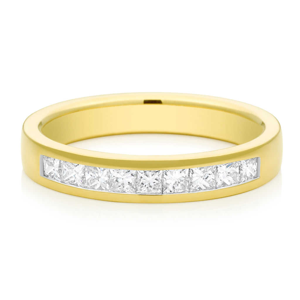 Celebrate eternal love with this Diamond Wedding Band. Featuring 1/2 Carat tw of princess cut diamonds in a channel setting, finished in 18ct Yellow Gold.