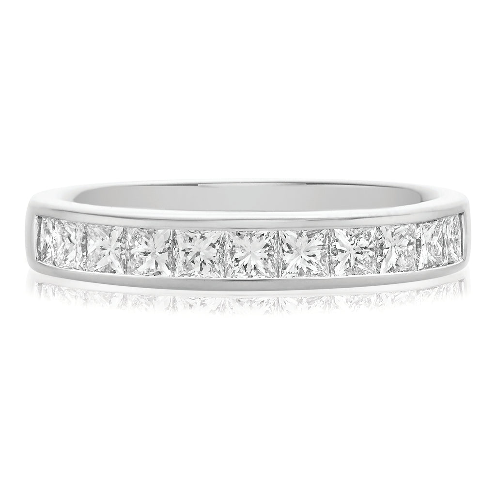 Celebrate eternal love with this Diamond Wedding Band. Featuring 1 Carat tw of princess cut diamonds in a channel setting, finished in 18ct White Gold.