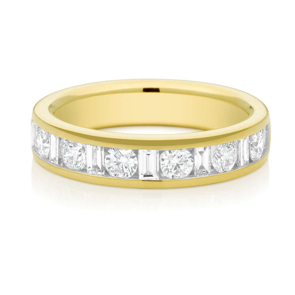 Celebrate eternal love with this Diamond Wedding Band. Featuring 1 Carat tw of round brilliant and baguette cut diamonds in a channel setting, finished in 18ct Yellow Gold.