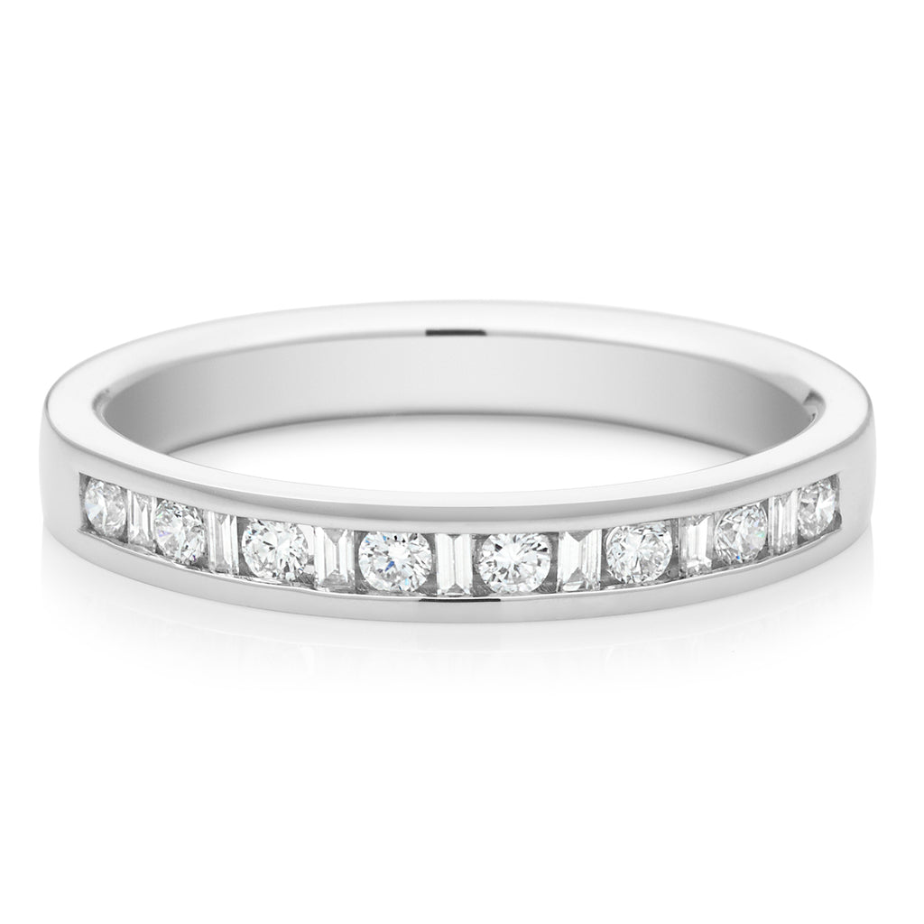 Celebrate eternal love with this Diamond Wedding Band. Featuring 1/4 Carat tw of round brilliant and baguette cut diamonds in a channel setting, finished in 18ct White Gold.