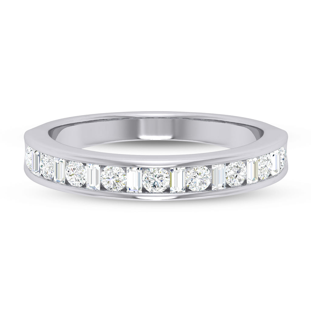 Celebrate eternal love with this Diamond Wedding Band. Featuring 1/2 Carat tw of round brilliant and baguette cut diamonds in a channel setting, finished in 18ct White Gold.