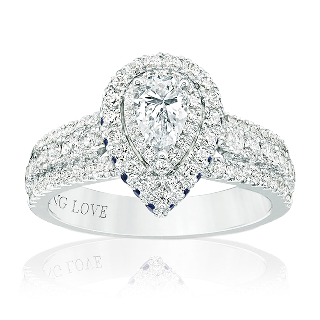 From the Vera Wang Love Collection, this entrancing gemstone and diamond engagement ring is a timeless combination. Crafted in 18ct white gold, this lovely style features a sparkling pear-shaped diamond centre stone wrapped in two frames of smaller round diamonds. The three-row diamond-lined shank adds texture to the design. Dazzling diamonds decorate the sides of the shank, while a frame of bright blue sapphires decorate the sides of the setting, Set into the bezel are two princess-cut blue sapphires, the signature of the collection and a symbol of faithfulness and everlasting love. This comfort-fit engagement ring is a beauty to behold.