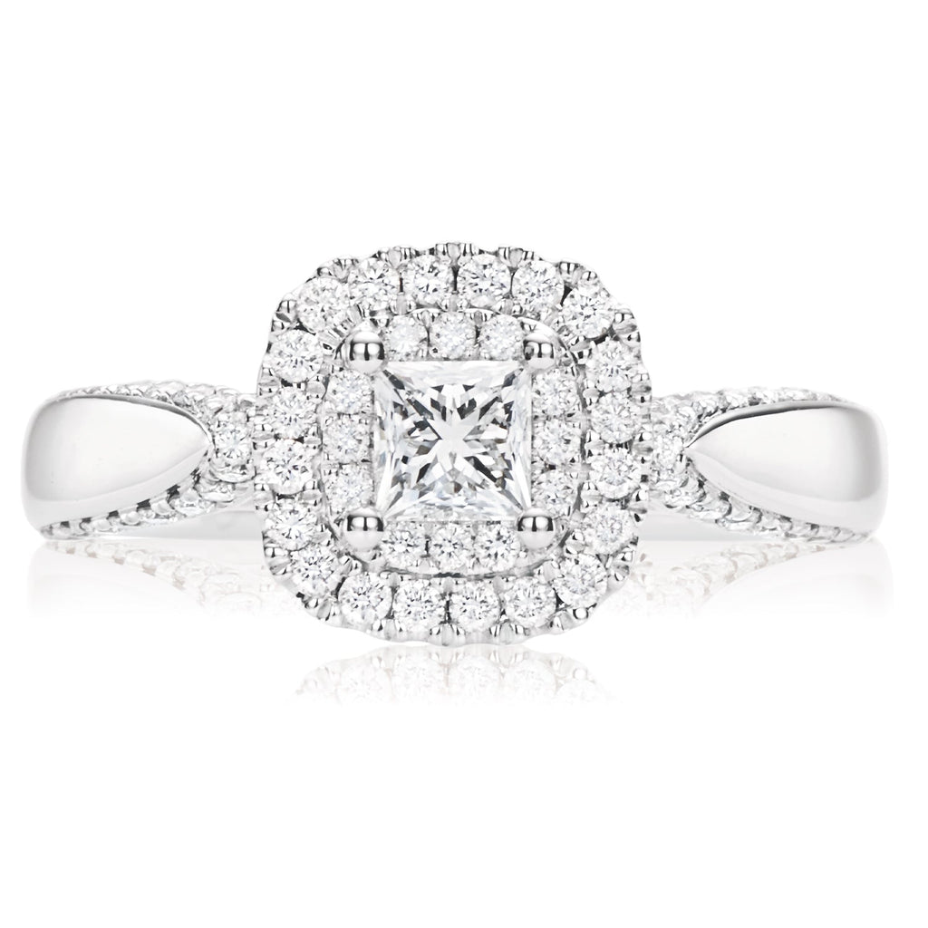 From the Vera Wang Love Collection, this captivating 18 Carat white gold engagement ring offers incomparable beauty and unmatched quality. Timeless and elegant, this ring features a mesmerizing princess cut diamond centre stone surrounded by a double squared frame of smaller accent diamonds. Set into the bezel are two princess-cut blue sapphires, the signature of the collection and a symbol of faithfulness and everlasting love. The simple polished shank is a thoughtful, classic touch. This engagement ring is a brilliant beginning to your romantic love story.