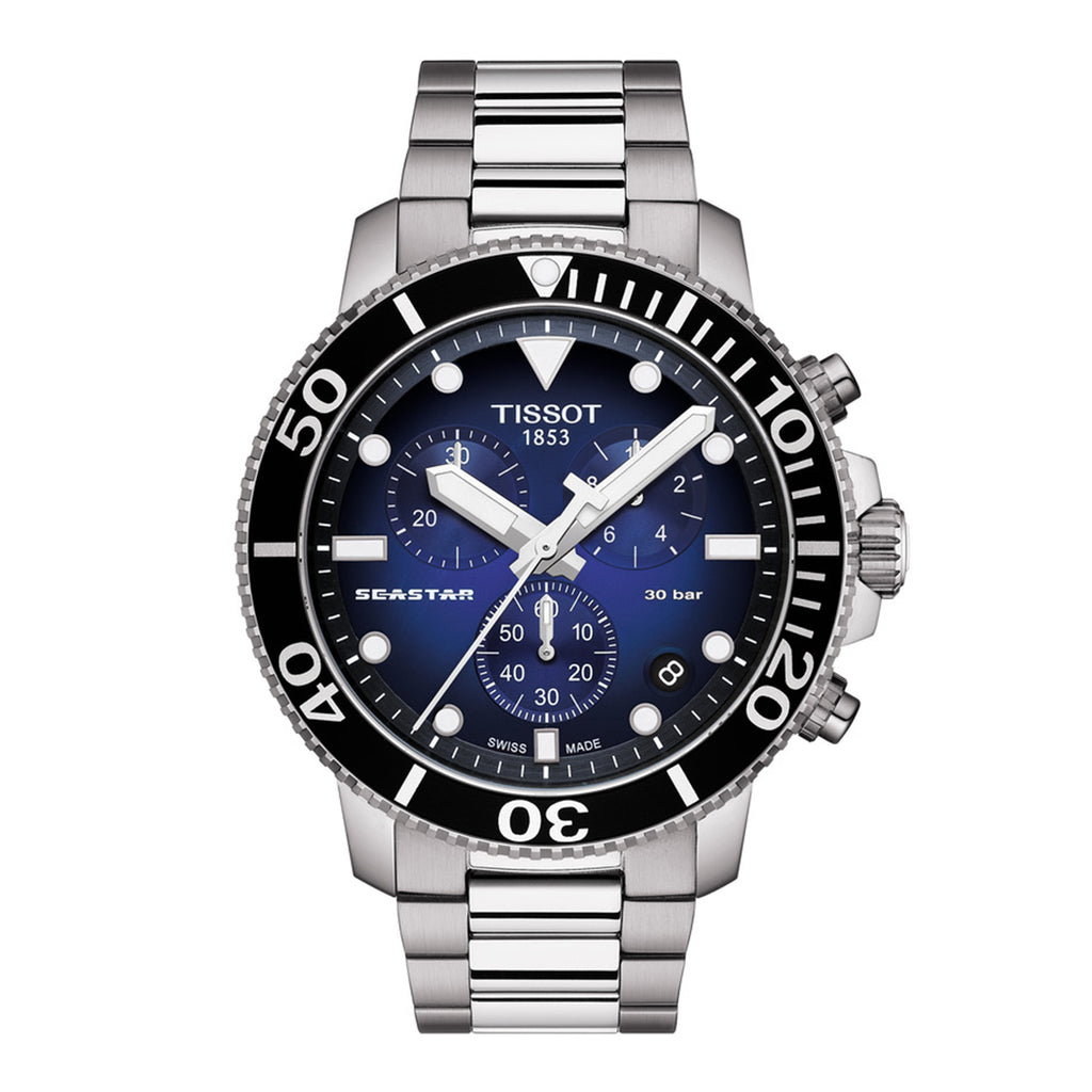 The Tissot Seastar 1000 Chronograph is the instinctive choice for water sports lovers. This high performance watch is water resistant up to an impressive pressure of 30 bar (300m/1000ft), has a screw-down crown and caseback, unidirectional steel bezel with aluminium ring and highly luminescent material for readability in the dark. Combined with the energy of a Swiss quartz movement and chronograph functions.