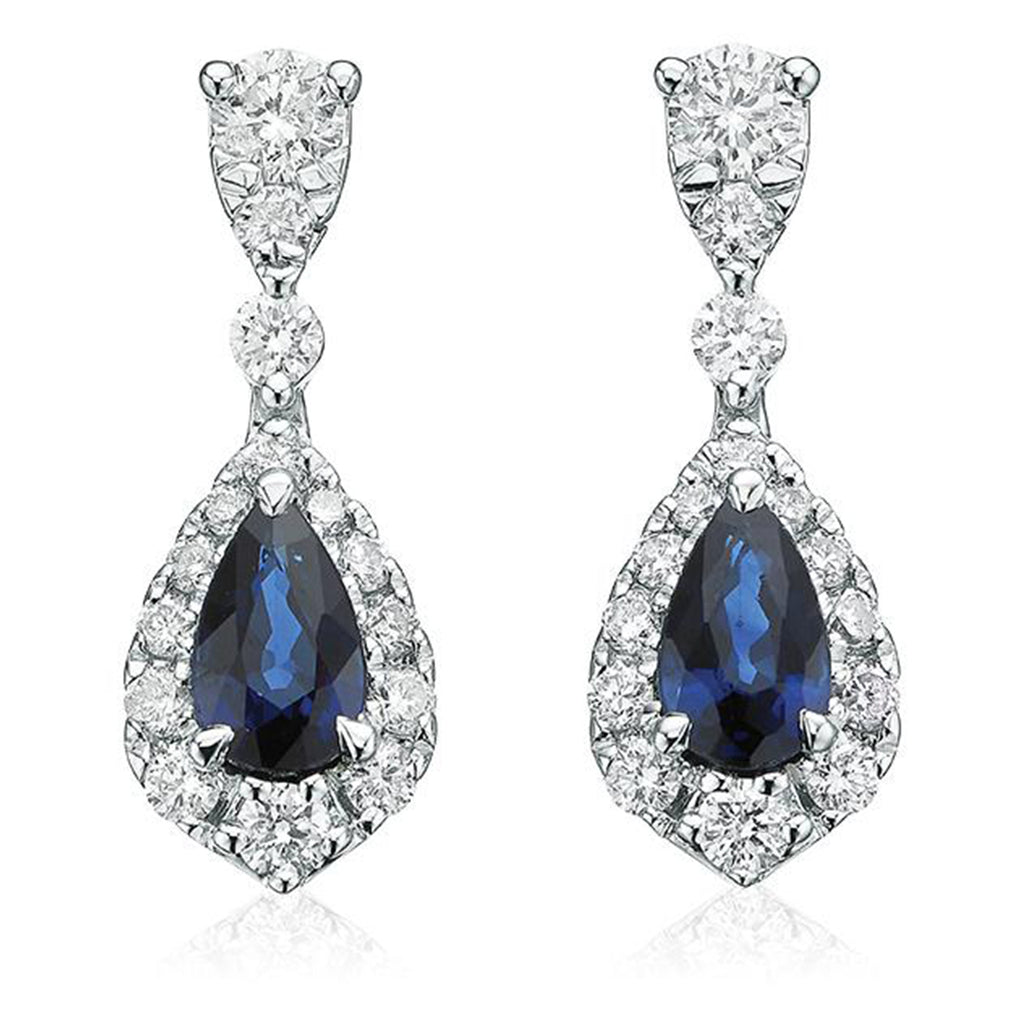 9ct White Gold Pear Cut Natural Sapphire & Round Cut 0.30 Carat tw of Diamonds Earrings