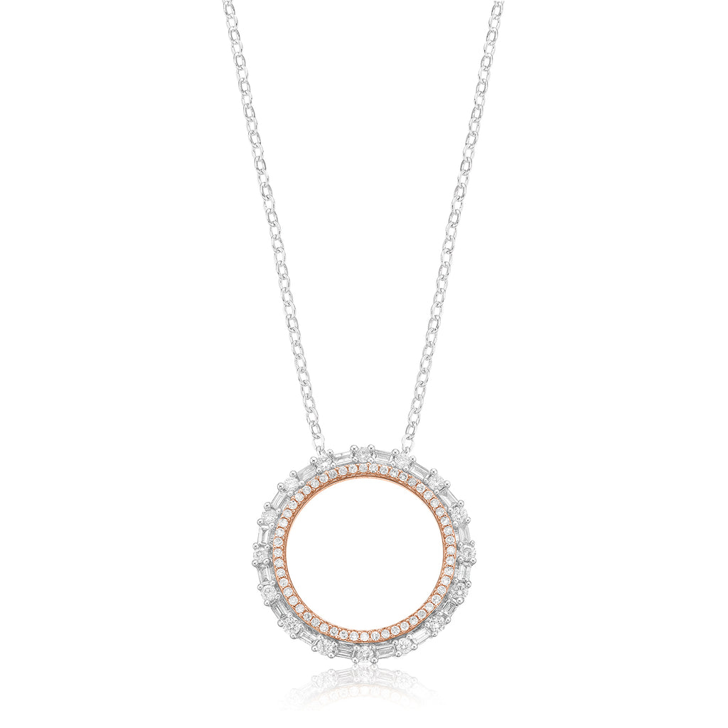 This open circle pendant is adorned in round brilliant and baguette cut diamonds totalling 3/4 Carat tw. Crafted in 9ct White and Rose Gold, this pendant is the perfect way to show your love.