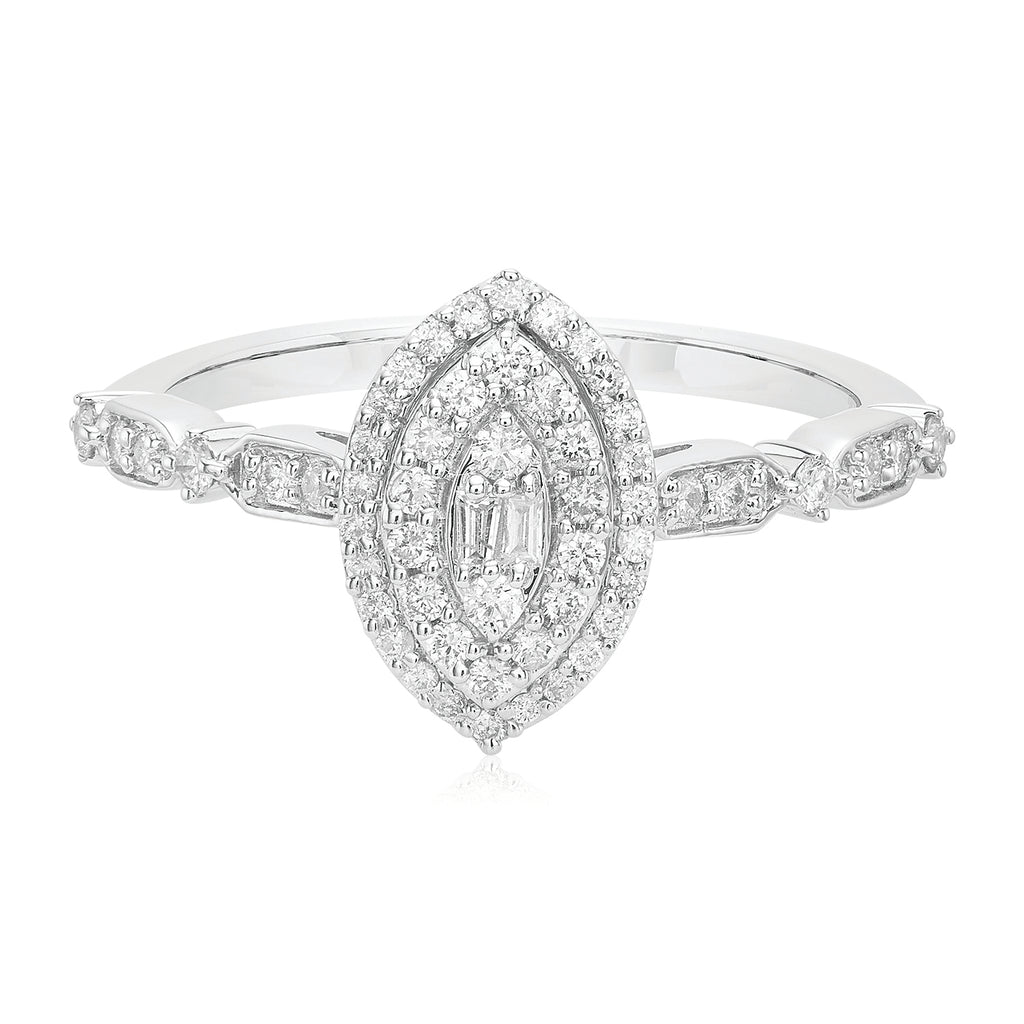This 9ct white gold baguette & round brilliant-cut dress ring has a beautiful design and is perfect to wear for special occasions. This ring will provide an elegant finish if you pair it with a matching pair of earrings and a necklace.