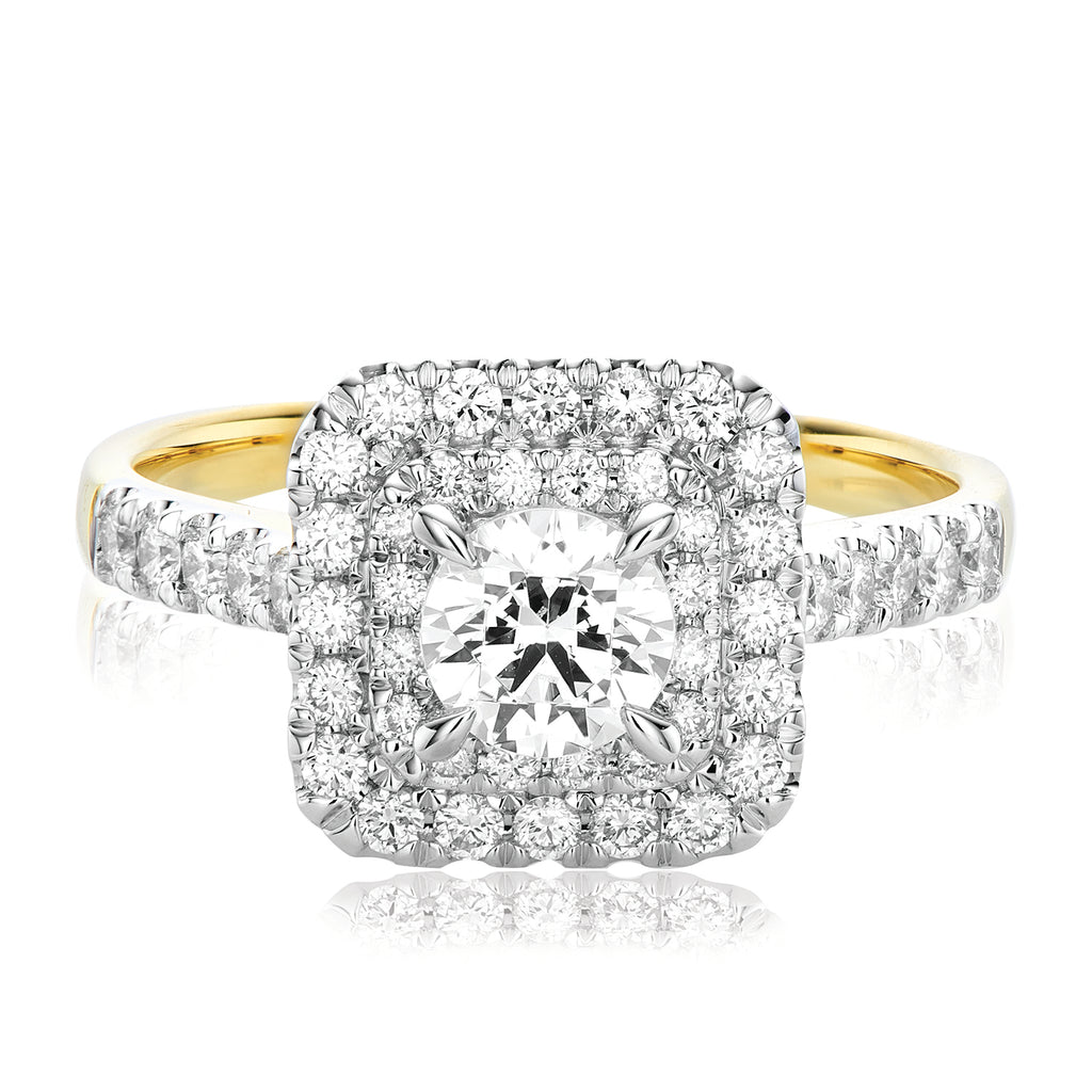 Our Halo Collection brings together classic, elegant and modern designs. This 18ct Two Tone Gold Halo ring is adorned in 1 Carat tw GIA certified Round Brilliant cut diamonds. Placed intricately on a square bevelled halo, with diamonds set shoulders.