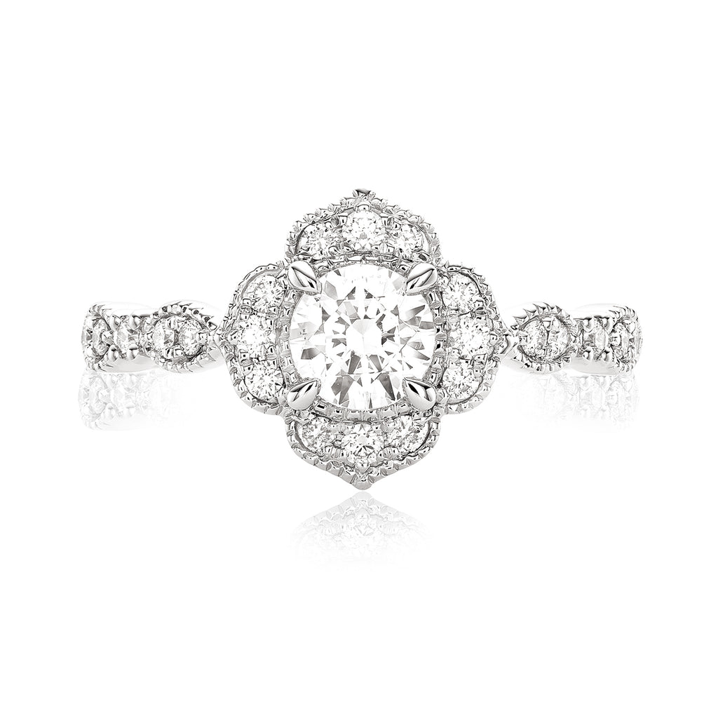 Our Halo Collection brings together classic, elegant and modern designs. This 18ct White Gold Halo ring is adorned in 3/4 Carat GIA certified Round Brilliant cut diamonds. Placed intricately along a flower bevelled Halo, enhanced with diamond set shoulders.