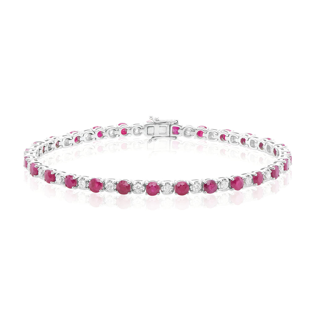 This unique 9ct White Gold tennis bracelet features round brilliant cut natural ruby and diamonds totalling 0.80 Carat tw. This piece is the perfect display of love for someone close to your heart.