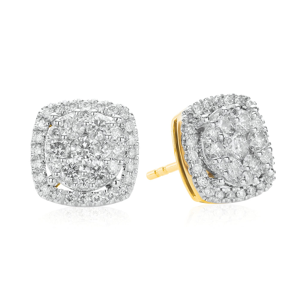These radiating earrings glisten brightly with every attire. Designed with luxury in mind, the glamorous square style entrants the eye. Classically shaped it is crafted in 9ct Two Tone Gold and embellished with 1 CARAT tw of round Brilliant Cut Diamonds. Marry with matching pendant for a complete set.