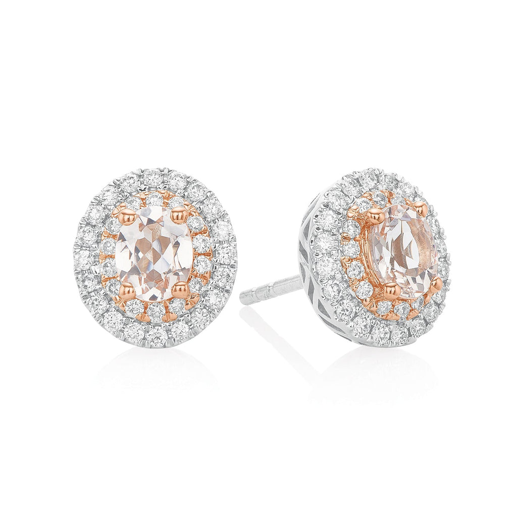 Morganite is a gemstone of divine love. It is believed to bring promise, healing, assurance and promise. These exquisite earrings feature an oval cut Morganite centre stone surrounded by a glittering double halo of Diamonds totalling 0.30 Carat tw and crafted in 18ct White and Rose Gold. Pair with matching ring and pendant for an elegant look.
