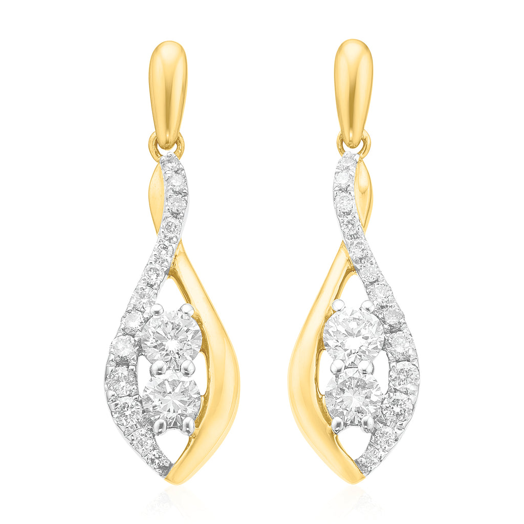 These earrings are created with 9ct yellow gold and feature a round brilliant cut diamond that is 0.38 carats.