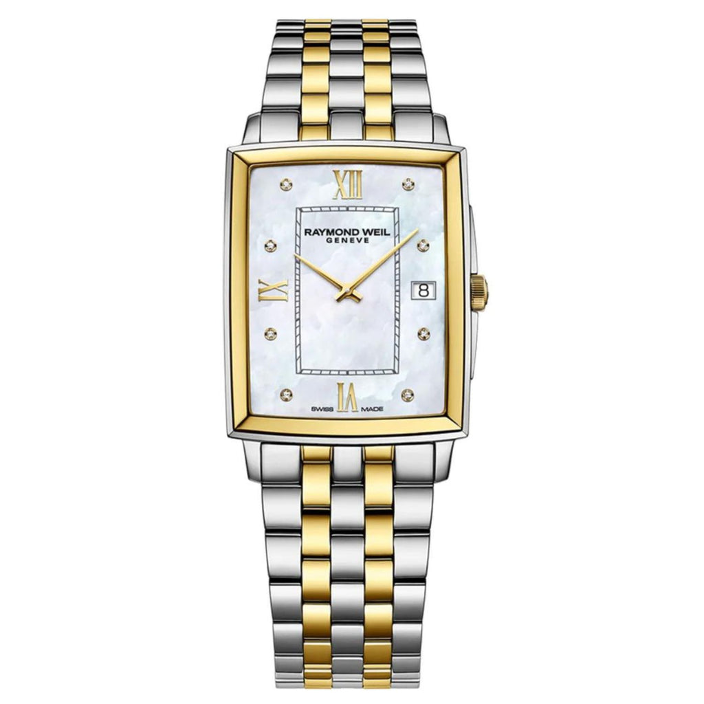 Equipped with a quartz movement, this toccata men’s classic two-tone watch features a sleek rectangular stainless steel case with yellow gold PVD plating, a date window at 3 o’clock and a white mother-of-pearl dial set with 8 sparkling diamonds to mark the hours; punctuated with Roman numeral markers to add a touch of warmth to this modern classic.