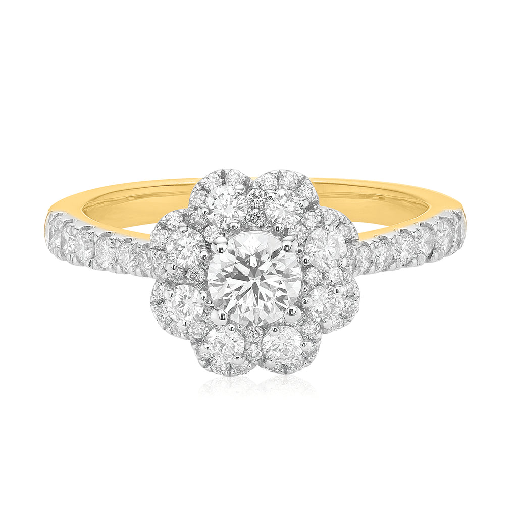 Our Halo Collection brings together classic, elegant and modern designs. This 18ct yellow gold Halo ring is adorned in 1.00 Carat tw GIA certified round brilliant cut diamonds.