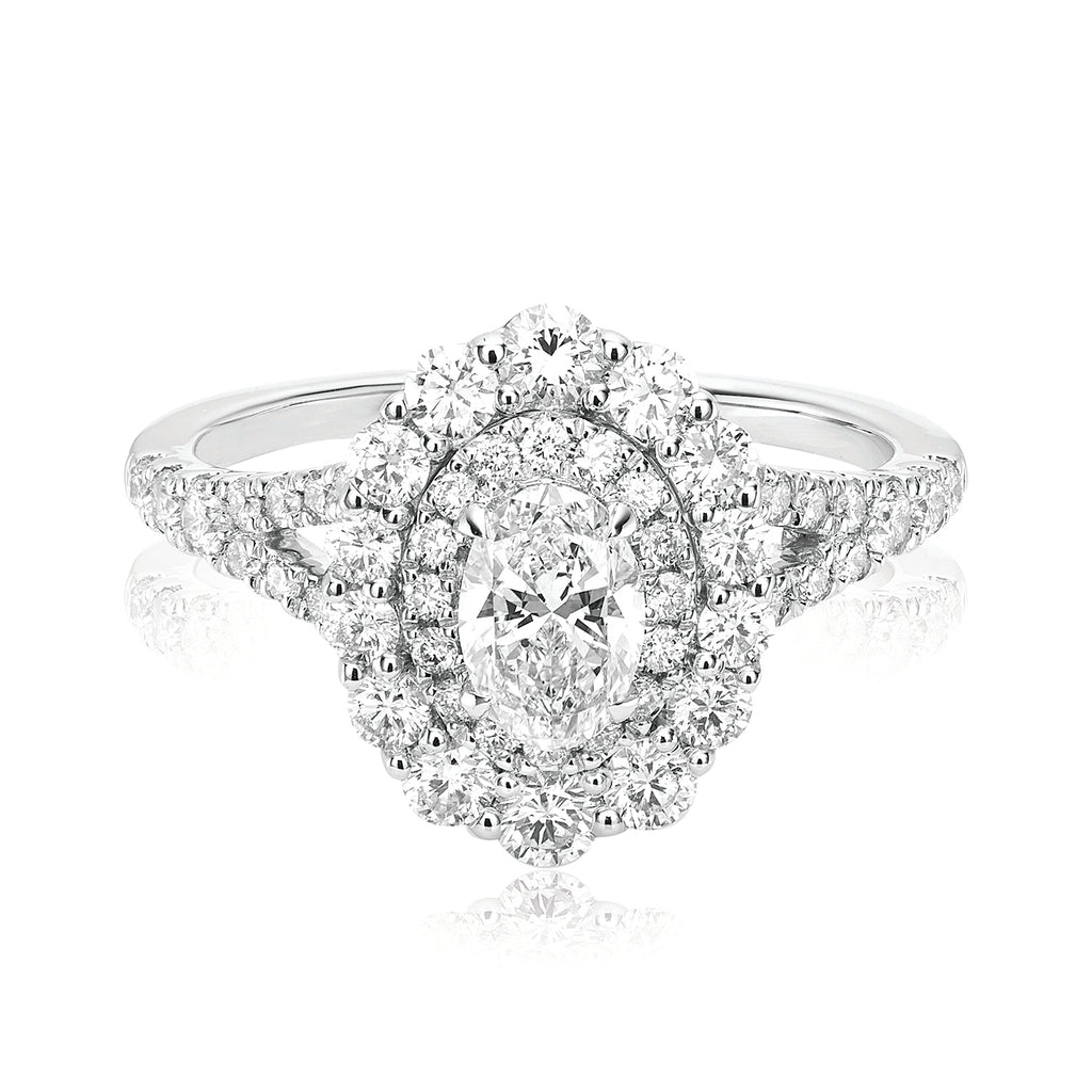 Our Halo Collection brings together classic, elegant and modern designs. This 18ct white gold Halo ring is adorned in 1.50 Carat tw GIA certified oval and round brilliant cut diamonds.