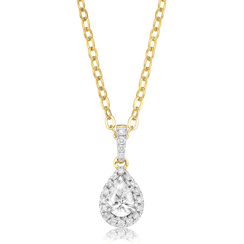 Our Halo Collection brings together classic, elegant and modern designs. This 18ct yellow gold pendant is adorned with 0.40 ctw GIA certified pear & round cut diamonds.