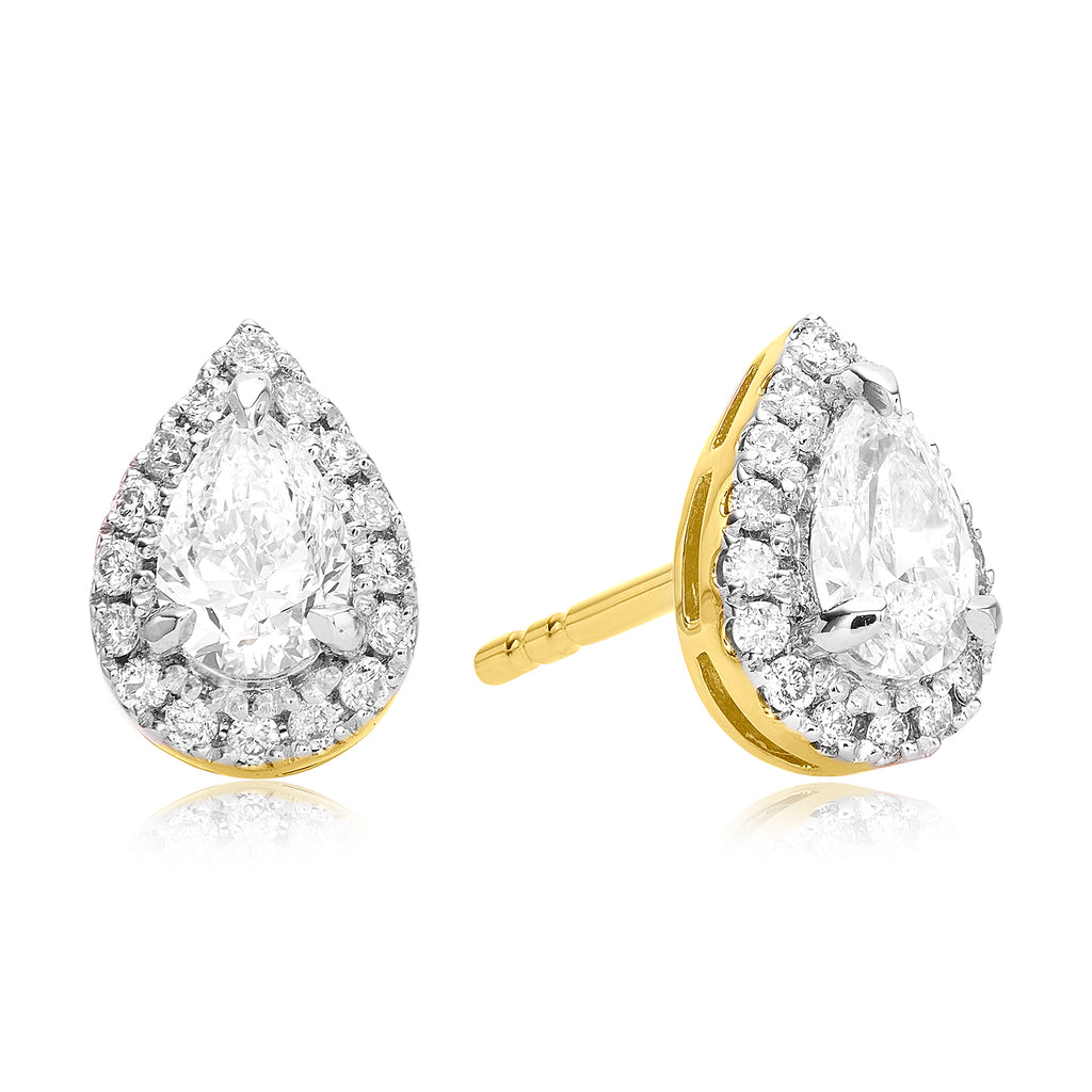 Our Halo Collection brings together classic, elegant and modern designs. This pair of 18ct yellow gold earrings is adorned with pear and round brilliant cut diamonds of 0.75 ctw.