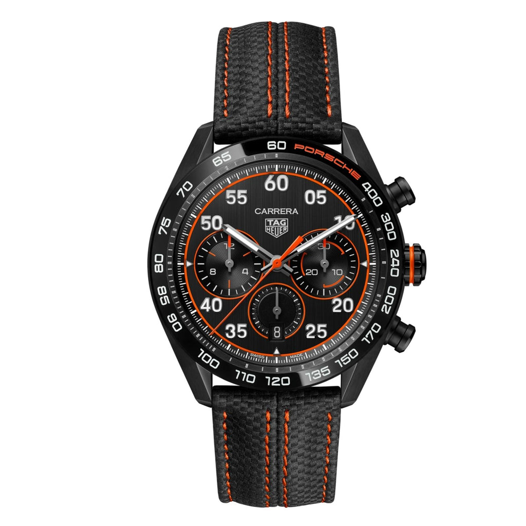 Speed is the name of the game in this TAG Heuer Carrera Porsche Special Edition. Paying tribute to the passion for racing shared by TAG Heuer and Porsche, it distills a bright orange inspired by the color of the sparks of heat made by the car on the asphalt. Victory is on the horizon.