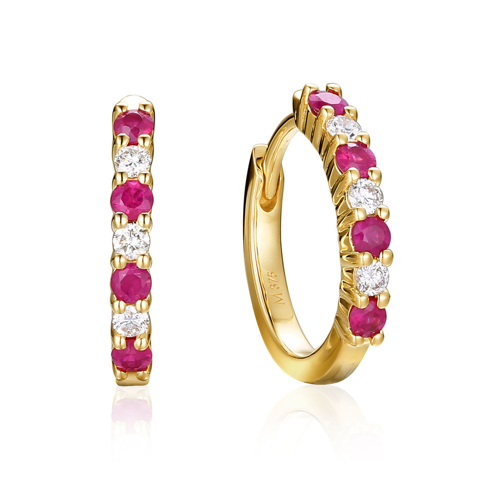 These exquisite 9ct yellow gold hoop earrings featuring round-cut ruby accents create an opulent statement. Each earring holds 2mm rubies, set in 0.14 carat tw to add a touch of sparkle and glamour to any look. Be the envy of all with these timelessly elegant hoops.