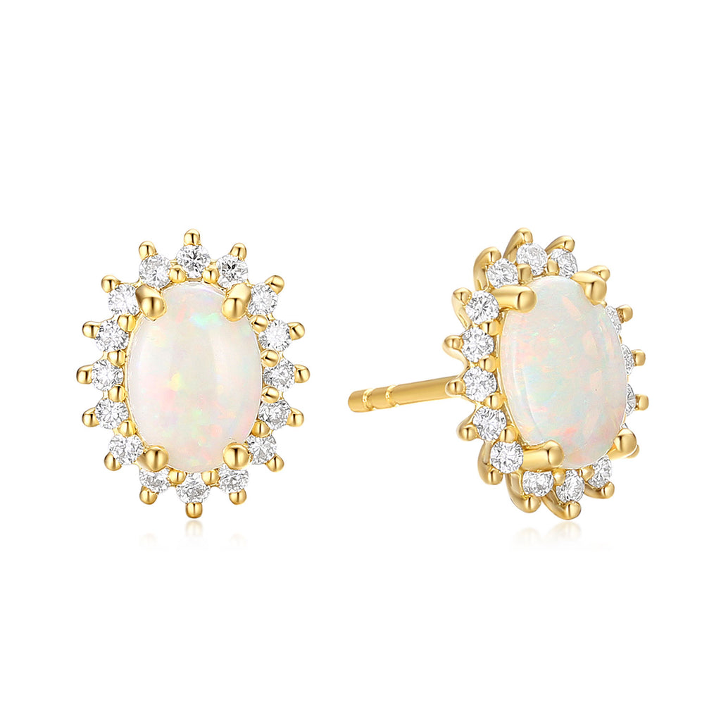 These exquisitely crafted 18ct yellow gold earrings with a glamorous oval cut 7X5 mm 0.25 carat tw diamond centerpiece will turn heads with a hint of vintage grandeur. Each earring is carefully set with dazzling white opal to complete the timeless, luxurious look.