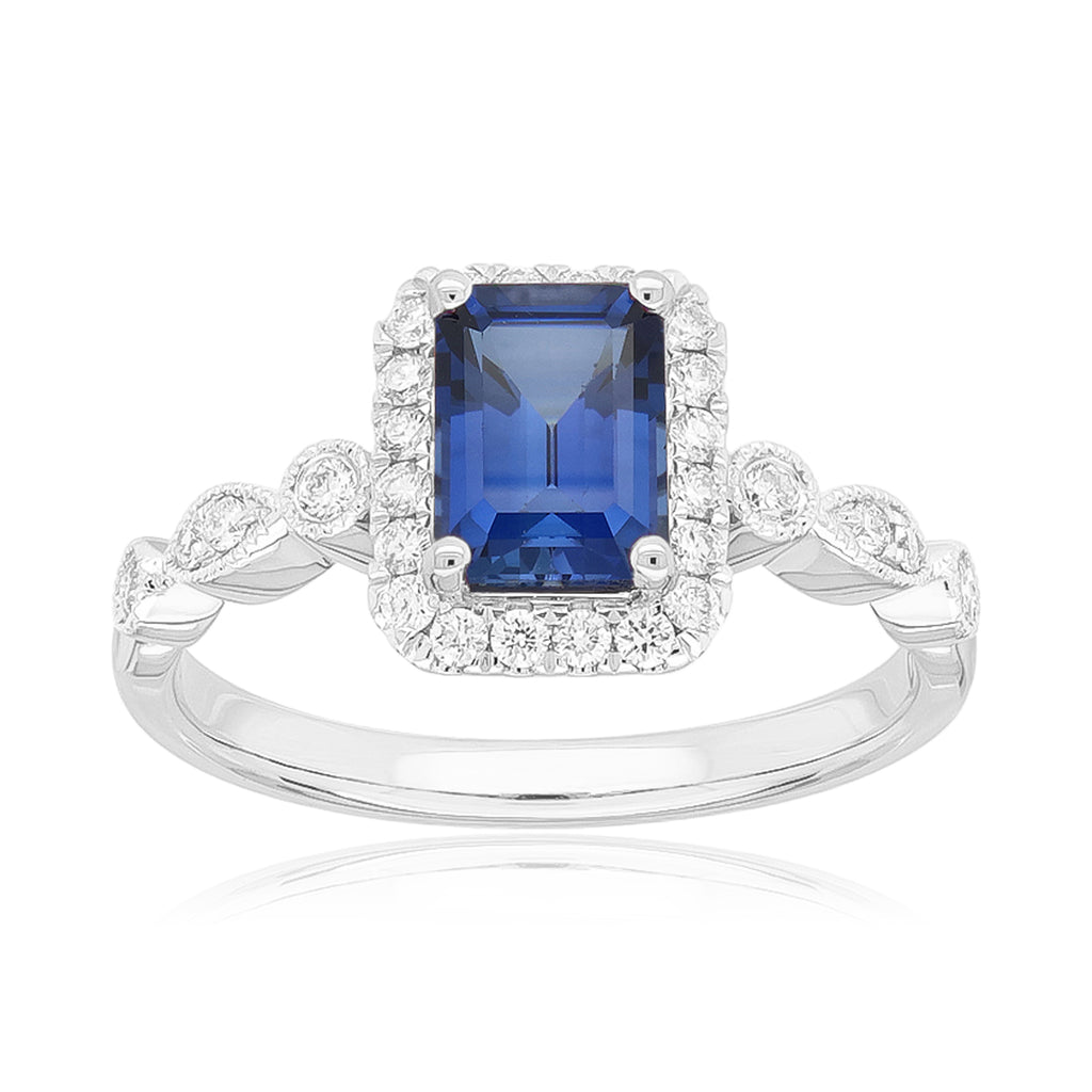 This exquisite heirloom 18ct white gold ring features a stunning emerald cut 7x5mm Tanzanite set with a 0.25 carat total weight of diamonds, perfect for a special occasion. Its luxurious design and craftsmanship make it a timeless classic, guaranteed to be cherished for generations.