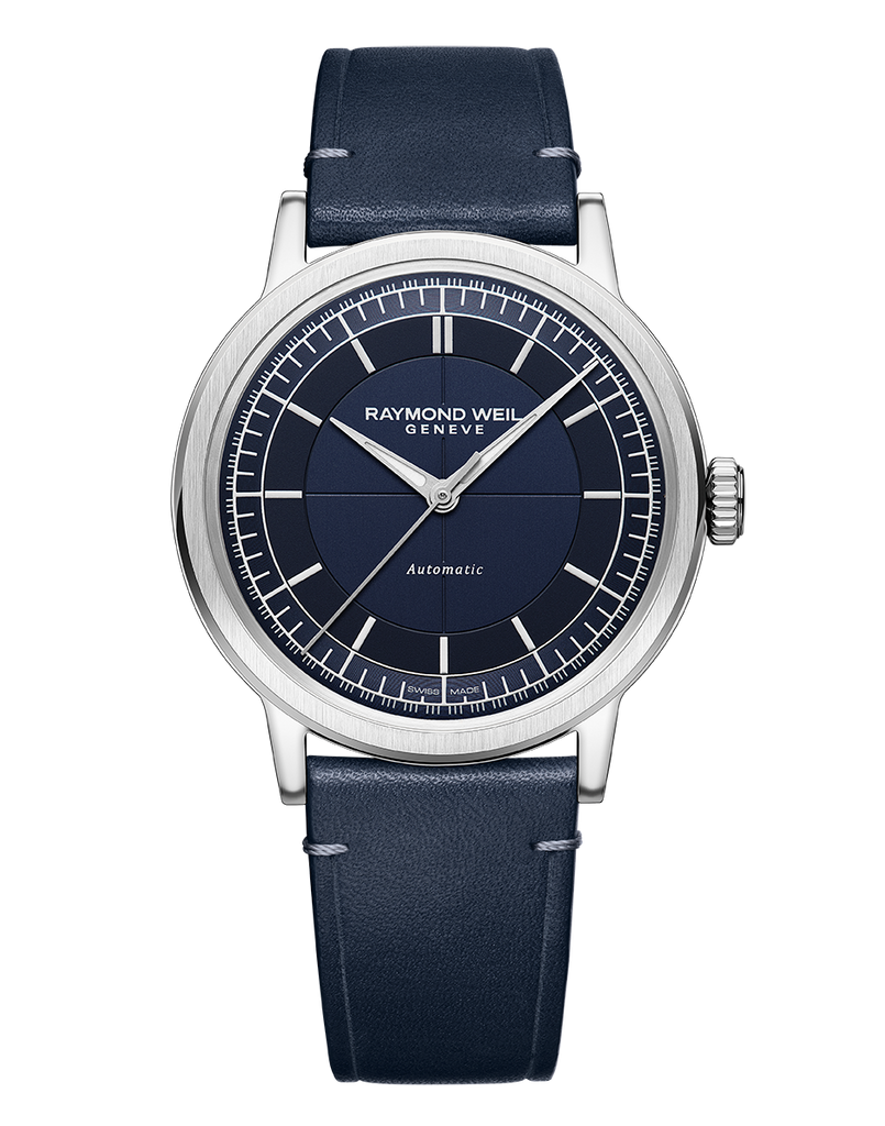 A sapphire caseback affords sight of the self-winding movement within and the “W-shaped” oscillating weight, RAYMOND WEIL’s horological signature. Offered in a selection of dial colours, each model is paired with a colour-coordinating genuine calf leather strap with a unique W-stitched detail.