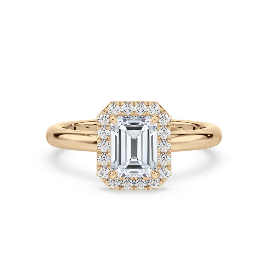Introducing our Halo 18ct Yellow Gold Emerald and Round Cut Diamond Ring, featuring stunning 1.7 carat tw GIA certified lab grown diamonds. The emerald cut centre diamond is elegantly surrounded by a halo of sparkling round cut diamonds, creating a luxurious and sophisticated piece. Elevate your jewellery collection with this exclusive and timeless ring.