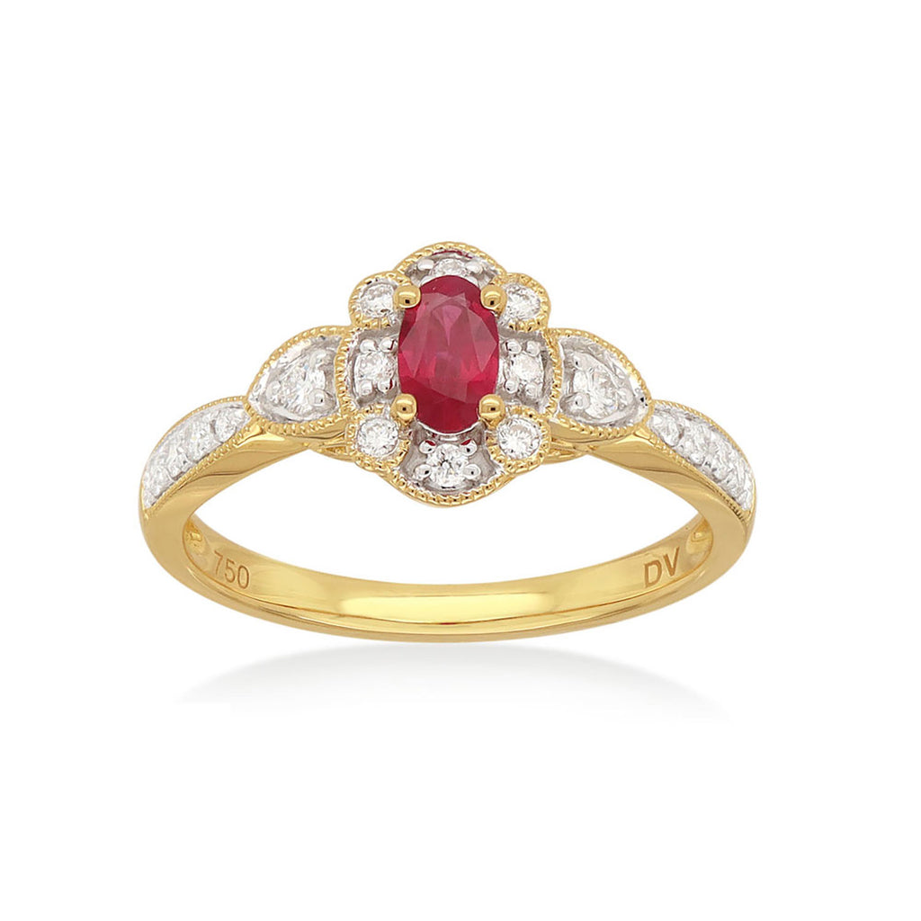 Indulge in sophistication with our Heirloom 18ct Yellow Gold Oval & Round Cut 5x3mm Ruby Diamond Set 0.20 Carat tw Ring. This elegant and exclusive ring features a stunning 5x3mm ruby set in 18ct yellow gold, accented with diamonds. Embrace luxury with a true heirloom piece.