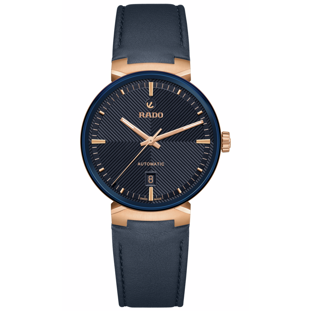 The contrasting rose gold-coloured applied hour markers, topped by the moving Rado anchor symbol, finished with brushing and polishing, create a hypnotising contrast against the blue background. The case is complemented by a brown leather strap, perfectly proportioned to the end links, and secured by a rose gold PVD-coated stainless steel pin buckle.