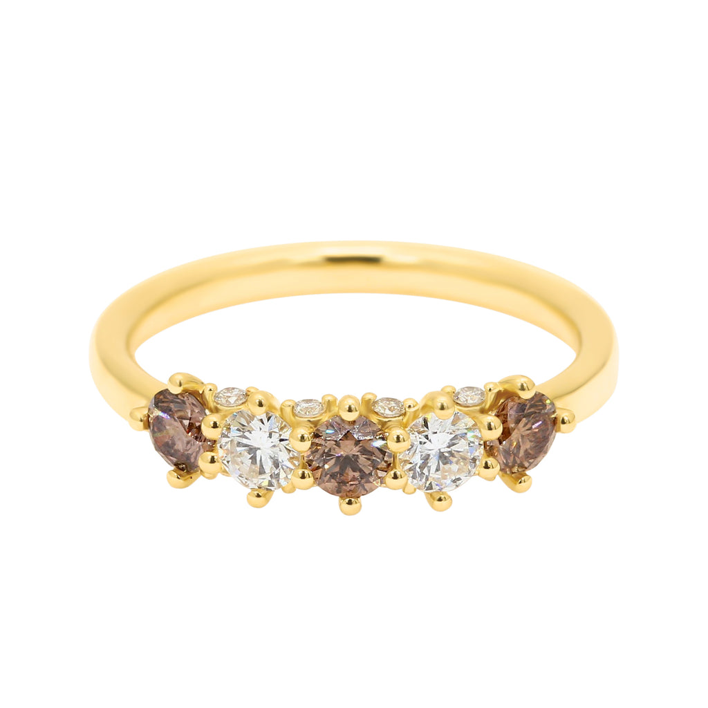 Crafted from 18 carat yellow gold, this diamond band showcases colour and sparkle. Set with three champagne diamonds totalling half a carat alternated amongst two fine white diamonds, this ring has a few hidden surprises - a sprinkling of fine white diamonds hidden along the settings of the larger stones - ensuring sparkle from every angle!