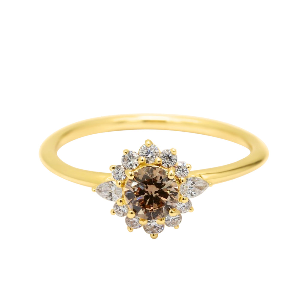 Crafted from 9 carat yellow gold, this diamond ring features a compass style halo made of round and pear shaped white diamonds, designed to emulate the north star. Set with a single 0.39 carat champagne stone with a rich C6/7 colour grade, this is a statement ring with the added flair of natural colour.