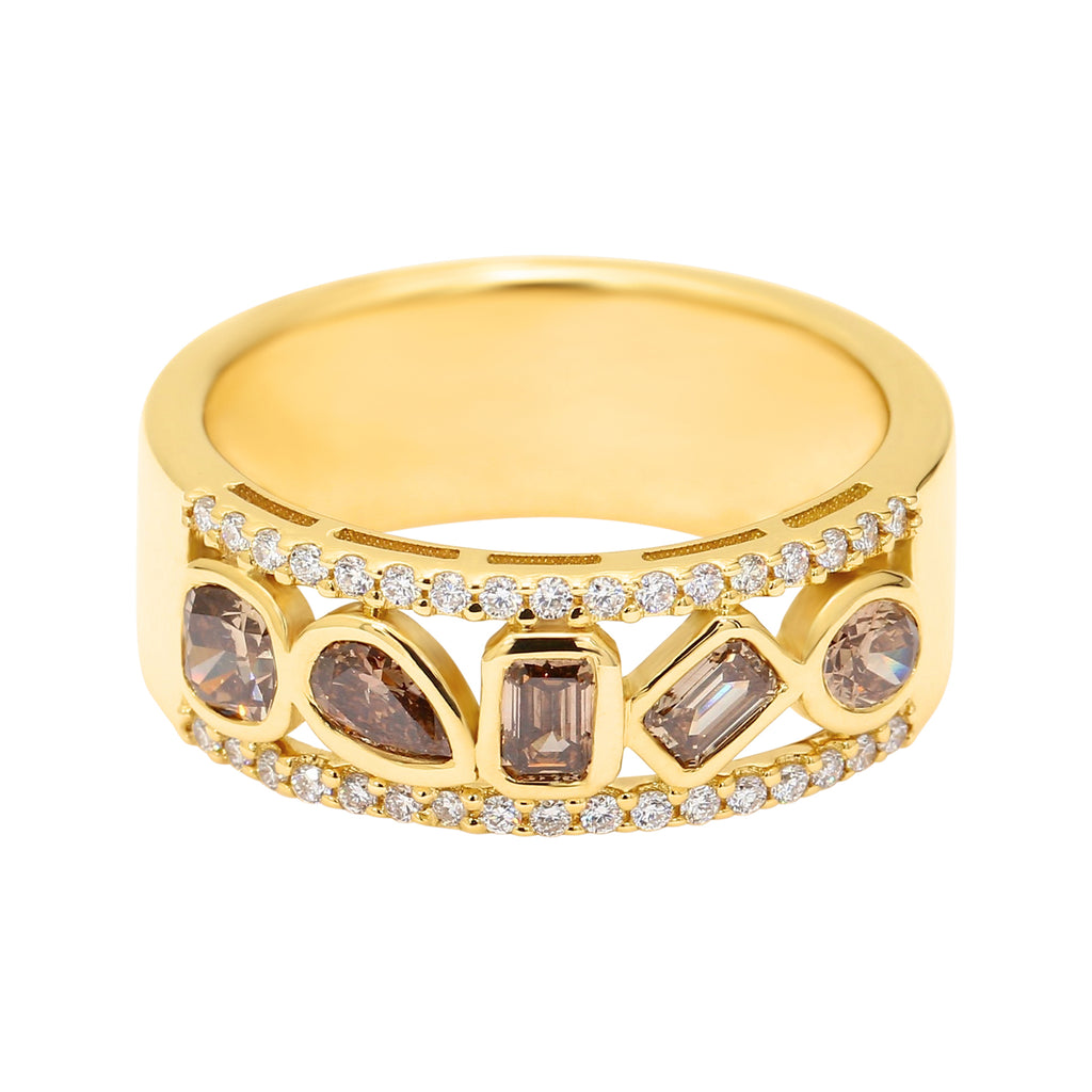 The champagne diamond dress ring features a unique array of fancy cut coloured diamonds set in 18 carat yellow gold bezels. This statement piece showcases over a carat of diamonds, including a cushion-cut, an emerald-cut, an oval cut, and a pear-cut diamond, each in rich C6/7 champagne hues. Complementing these are 34 fine white diamonds channel-set along the rails - a stunning display of cut and colour!