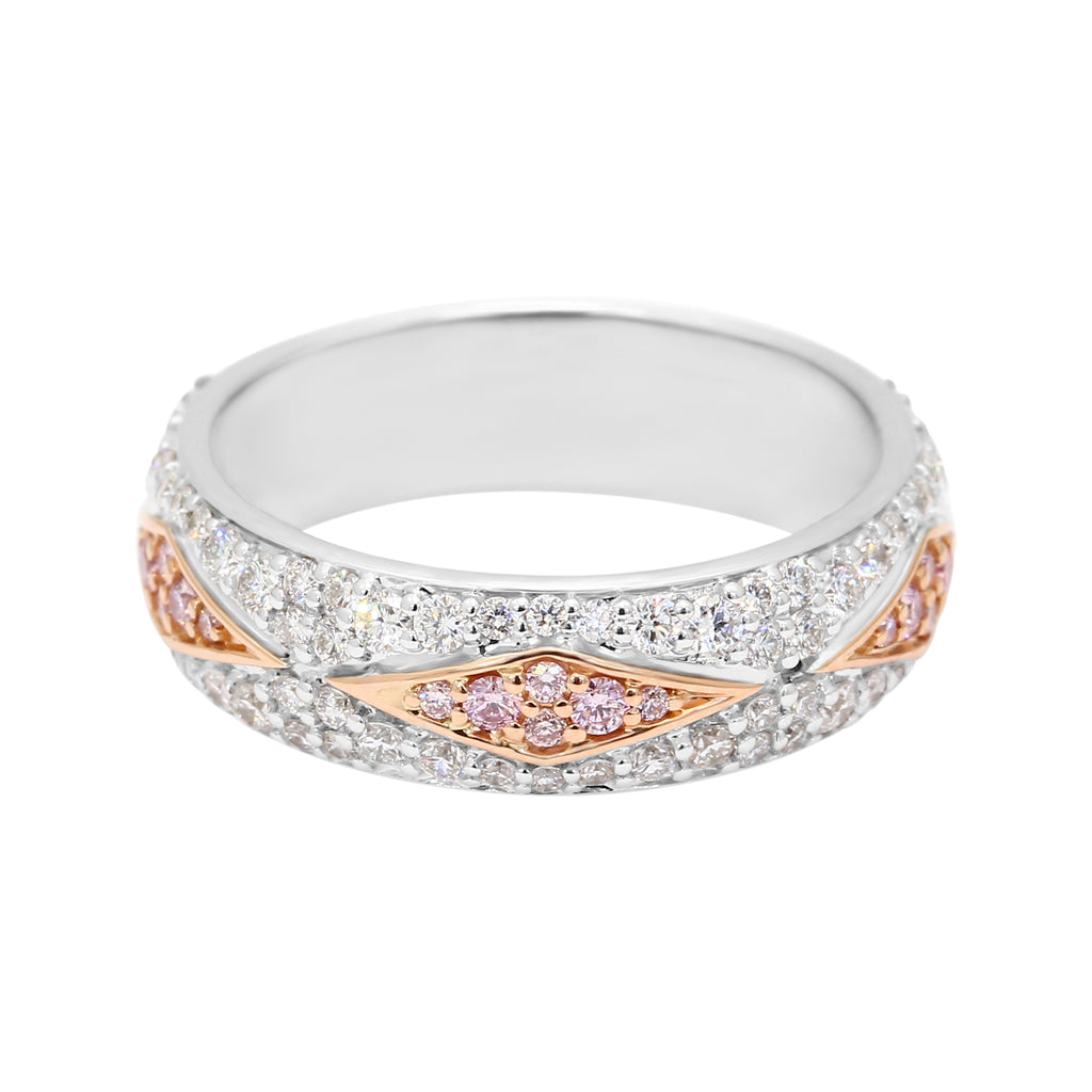 Crafted from 18 carat white and rose gold, this stunning diamond dress ring is designed to add dramatic sparkle to every day. Set with twelve 6-7PR Lot Numbered Argyle pink diamonds in rose gold accents and a further 74 white diamonds totalling 0.74 carat, all pave set in a classic dress band, this ring is inspired by the bandeau tiaras worn by royalty.