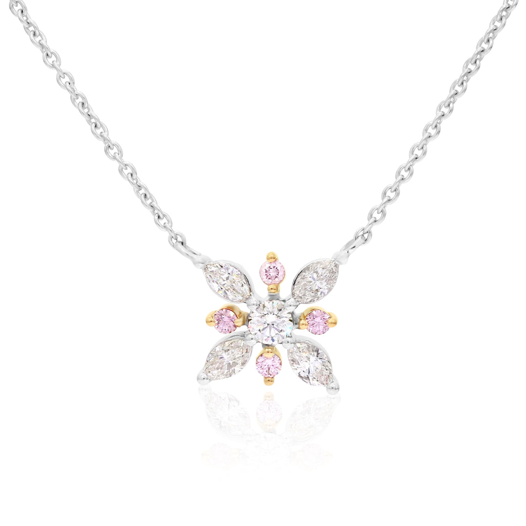 The Polaris necklace, named for the north star, is meticulously crafted from 18 carat white and rose gold to showcase a stunning arrangement of premium sparkle. The four round-cut Lot Numbered 7-8P/PR Argyle pink diamonds add a touch of rare colour, amongst a starburst style setting of marquise-cut white diamonds to ensure this fixed pendant is always a focal point.