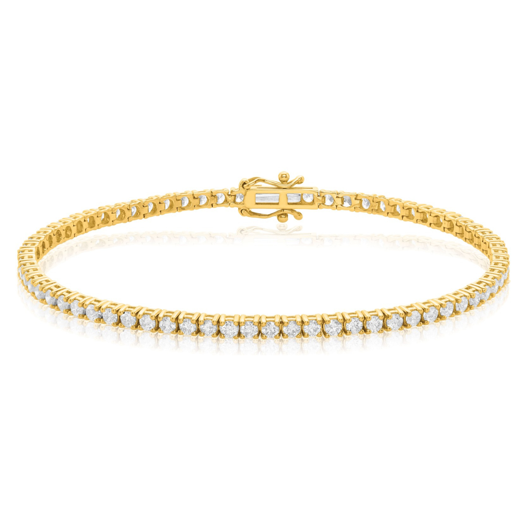 Discover timeless elegance with this exceptional tennis bracelet, expertly fashioned in 9ct yellow gold. Featuring 3.00 carats of gorgeous round cut diamonds set in a graceful continuous line, this piece delivers captivating sparkle with every movement. The warm glow of yellow gold complements the diamonds' brilliance, creating a harmonious interplay of light and luxury. Equally at home with day or evening wear, this sophisticated bracelet elevates any ensemble with its refined aesthetic and enduring appeal.