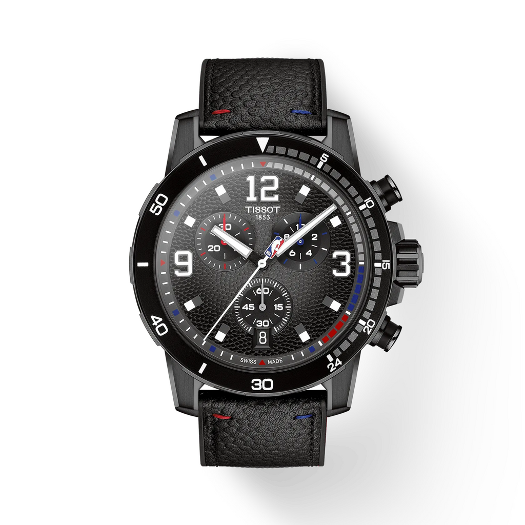 The NBA Supersport Special Edition honours basketball with thoughtful details and a sporty style. The striking 45mm black PVD-coated stainless steel case features a bezel incorporating the 24 seconds rule drawing from the NBA’s shot clock with colour accents hinting at the league. The dial, featuring a basketball dot pattern and a gradient fade from dark grey to black at the edges, creates an illusion of depth that mirrors the shape of the ball. Numeral indexes, like those on player's jersey, add a meaningful touch, while the NBA logo on the second hand serves as a further tribute to the sport.