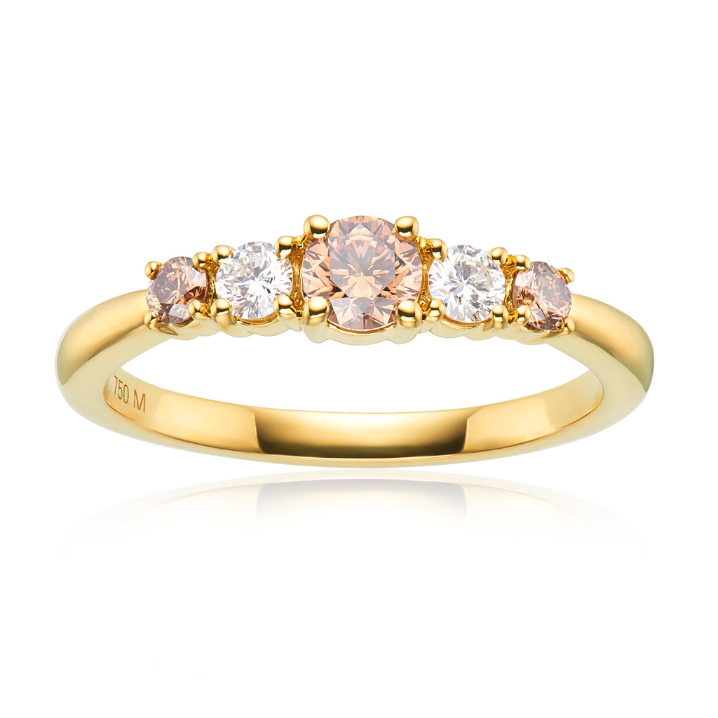 Elevate your jewellery collection with this magnificent Kaléidoscope ring, expertly fashioned in premium 18ct yellow gold. Showcasing a mesmerising composition of round-cut Australian champagne and white diamonds with a combined weight of 1.00 carat, this piece radiates unparalleled brilliance and warmth.