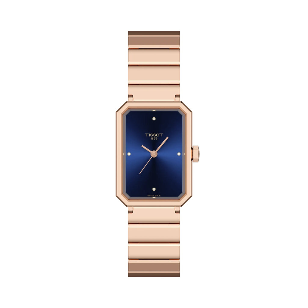 The SRV watch is inspired by the Art Deco times, developed in the 1920s. This time is characterised by geometric shapes and abstract patterns, become a dominant style in architecture, interior design, fashion and graphic arts. While the SRV is directly inspired by a model from 1975, that very design was itself a reinterpretation of Tissot’s earlier creations from the 1920s. The SRV’s quartz movement delivers precision that empowers to move forward fiercely and, with the End-of-Life indicator, the SRV anticipates her next move, so she’s always prepared. More than a name, SRV stands for, Sapphire Rectangle V: a faceted sapphire glass with a rectangular silhouette, and the ‘V’ a nod to its 5-bar water resistance, symbolised by the roman number 5. This rectangular watch with four diamonds on the dial will elevate your look and offer you confidence and comfort. The metal bracelet is comfortable, robust, easy to clean and long-lasting.