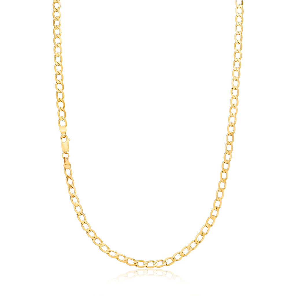 Crafted in 9ct Yellow Gold, this men's curb chian features iconic bevelled links. Measuring 55cm in length, this classic chain secures with a lobster claw clasp.