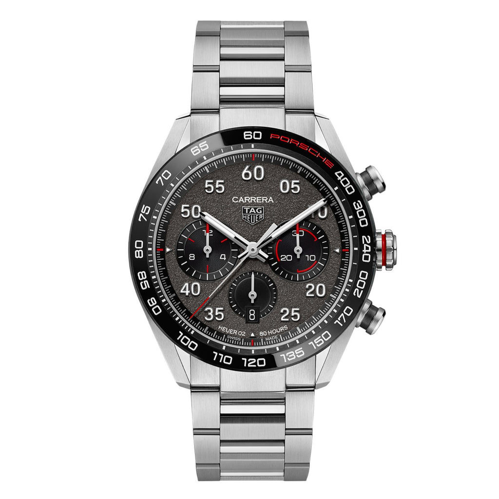Featuring numerous references to Porsche and TAG Heuer codes; the Porsche colors of red, black, and grey, along with the asphalt effect dial, perfectly expresses a passion for the road. At the heart of this stunning timepiece is the in-house Calibre Heuer 02 manufacture movement with an impressive 80-hour power reserve.